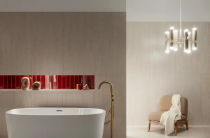 Materiały są wysokiej jakości, ale bardziej uporządkowane wizualnie – gładkie powierzchnie, wielkoformatowe płytki, szkło, lakierowane fronty. Wszystko jest precyzyjne i dopracowane w detalach.